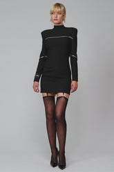 The dress is embellished at the neckline and elbows with openable gold-tone metal zips and a two-way zip fastening at the back to ensure a perfect fit and elegantly emphasise your curves. The high neck and straight sleeves give this dress a sophisticated look.