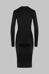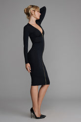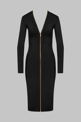 The midi dress stands out for its body-hugging cut, which creates a clean, confident silhouette. Made from opaque stretch jersey, it has long sleeves and a plunging V-neck that can be adjusted with the gold metal zip, so you can choose between a bold or more reserved look, depending on the occasion. The two-way zip designed by Maison Close runs the length of the dress, passing through the nape of the neck like jewellery.