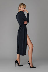 The midi wrap dress stands out for its structured, wrap design. Epaulettes adorned with flat pleats create a sleek, assertive silhouette. It is made from double-sided opaque satin for softness, a flowing style and incomparable quality. It has a seductive look with its deep V neckline and subtle leg-baring design.