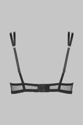 ¼ cup bra teaming Gothic lace in front and Swiss dot mesh. With underwiring and padded cups plus adjustable double spaghetti straps. Unbuttons in front for a cupless effect, adjusts with hook-and-eye fastening at the back.
