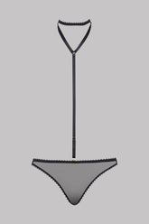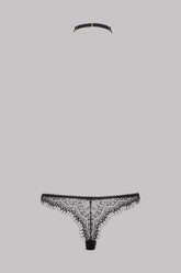 Brazilian string in recycled lace. Shape combining an eyelash lace at the back with see-through tulle at the front edged with picot elastic. Choker harness can be adjusted and removed at the string. Harness can be opened and adjusted with a gold-tone fastener at the back of the neck.