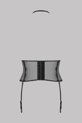 Waist-cincher suspender belt in recycled lace. Shape combining an eyelash lace with see-through tulle edged with picot elastic. Graphic cut that accentuates the waist. Suspenders and choker harness are removable and can be adjusted with gold-tone accessories. Flexible vertical whalebones for improved structure and support. Adjustable hook-and-eye fastening on the back. Can be worn as a suspender belt or a waist-cincher.