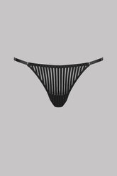 Microfibre adjustable mini thong with openwork, transparency and graphic stripes. Elastics with adjustable silver trim on the sides adapts to all body types.