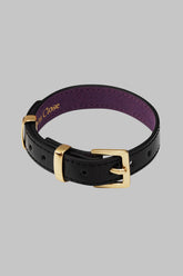 La Liaison is an anklet designed as a jewel for the skin. Its glossy black patent exterior contrasts with a soft violet suede-like lining – a subtle nod to the Maison Close signature hue. The golden logo is discreetly placed on the inside for an intimate touch.