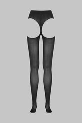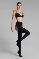 70D backless tights in soft, matte opaque veil, offering uniform coverage that sculpts the legs. The open-back design boldly frames the curves and reveals the rear, while preserving full opacity on the front and legs.