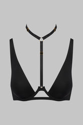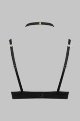 The TAPAGE NOCTURNE halterneck bra is crafted from matte, opaque black microfiber. Its plunging halterneck silhouette, structured with underwires beneath the bust, sculpts a clean, deeply defined neckline. At the center of the chest, a removable harness secured with a hook rises to the neckline, adjustable in height and fastening at the nape, transforming the piece into a true jewel of lingerie. Adjustable straps and a hook-and-eye back closure complete this graphic, refined design, to be worn alone or paired with the bottoms and accessories from the TAPAGE NOCTURNE line.
