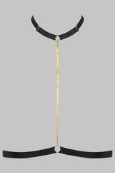 The TAPAGE NOCTURNE jewelry harness frames the bust like a nocturnal adornment. Crafted from matte, opaque black microfiber, it embraces the skin with a second-skin effect, while a removable snake chain links the underbust band to the choker ring, tracing a luminous line along the neckline. Fully adjustable and opening at the back and neck with hooks, it layers over lingerie or an open silhouette to define a graphic, nocturnal and resolutely statement look.