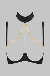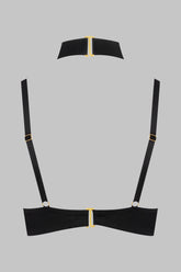 The TAPAGE NOCTURNE open jewelry bra reveals the bust while framing the breasts with precision. Crafted from matte black microfiber, it is structured with underwires beneath the bust that support and enhance the curve. Three removable snake-chain jewels rest against the skin like strokes of light around the neckline, connected to a choker that is also removable and adjustable. A true piece of lingerie jewelry to wear directly on the skin, alone or paired with the jewelry thongs from the line to create a boldly statement-making ensemble.