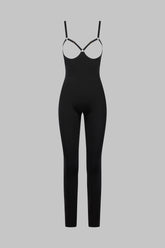 The TAPAGE NOCTURNE open catsuit sculpts a full second-skin silhouette, where every line structures the body with precision. Crafted from matte black microfiber and elevated by a bonded seamless finish with no visible seams, it envelops the figure in smooth, opaque black.