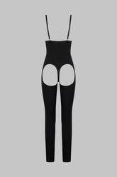 With the breasts left bare, the bust is supported by underwires beneath the chest and adjustable elastic straps that frame it with exactitude. At the back, adjustable straps refine the line, while the open buttocks place the curve at the forefront. The long legs, finished with a seamless edge, extend the allure down to the ankles. A slit at the crotch completes this stage-inspired lingerie piece, designed for boldly nocturnal hours.
