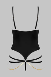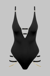 The TAPAGE NOCTURNE V-neck jewelry thong bodysuit sculpts an ultra-graphic silhouette, focused on the neckline and hips. Crafted from matte, opaque black microfiber, it is elevated by a seamless finish for a true second-skin effect. The V-shaped neckline is punctuated by two elastic bands, one adjustable in width, and adjustable straps that elongate the line. Along the hips and buttocks, a play of non-removable, adjustable straps frames the curves, while two removable snake chains highlight the sides. The high-cut thong back and adjustable hook fastening at the crotch complete this nocturnal piece of lingerie jewelry, to be worn alone or layered beneath an open silhouette.