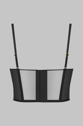 The L’AMOUREUSE bustier bra, in tulle of absolute transparency, features seamless molded cups with underwires to shape the bust. The tulle is doubled at the front and sides for a contrast of transparency and opacity, while soft vertical boning at the front and back structures the bust. Fine, removable, adjustable straps and a smooth, delicate back hook closure complete the construction.
