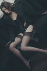 The wide straps, velvet-covered at the front, are adjustable and removable for versatile styling. At the back, an adjustable lace-up detail, adorned with gold eyelets and jewelry-finish tips, allows for custom shaping. A ready-to-wear lingerie bustier, designed as an architecture of desire – to wear under a shirt or boldly on display.