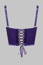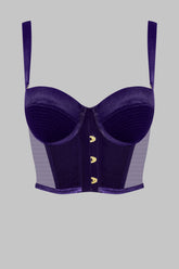 ROCOCO bustier bra in velvet, inspired by traditional corsetry, designed to gently sculpt the silhouette. Flexible steel boning structures the fit, while lightly padded underwired cups with removable inserts create a controlled push-up effect.