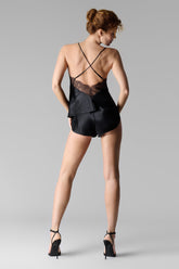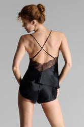 Camisole in natural silk and eyelash lace. Ultra-feminine cut with a V neckline and bare back adorned with rigid lace that delicately hugs the figure. Fine silk adjustable straps with golden accessories cross the back.