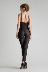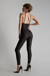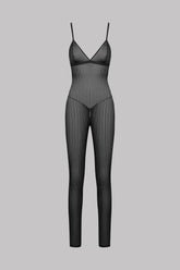 Microfibre catsuit with openwork, transparency and graphic stripes. A mesmerising garment that elongates the body. Triangle cups give a plunging neckline. Opens at the crotch with a front to back zip. Elastic, detachable straps with silver accents.