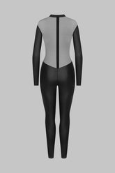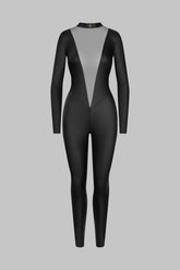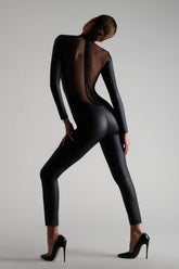 Matte leather effect and sheer tulle catsuit. Graphic plunging V-cutout on the tulle to show off the décolleté and back. Fastens from front to back with a tone-on-tone two-way zip. The collection's signature "feti-chic" ring embellishes the neck, inviting you to attach it.