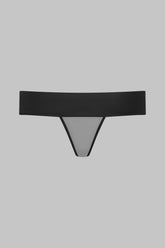 Tanga briefs with provocative leather effect fabric on the waist and sheer tulle on the crotch and buttocks. The collection's signature golden "feti-chic" ring embellishes the front, inviting you to attach it.
