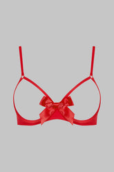 Peephole microfibre basque bra with elasticated picot trim. Cupless design with two pieces of elastic; this underwired style daringly reveals the bust. Clip the removable satin bow wherever you please like a little present. Elasticated straps can be adjusted with tone-on-tone accessories. Adjustable hook-and-eye fastening on the back.