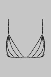 Triangle jewellery featuring jet black faceted glass beads. The "À ton cou" triangle bra reflects the light as you move. Adjustable thanks to chains that can be altered to fit you.