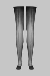 Maison Close's signature suspender stockings. Black with delicate silver LUREX® stitching that elegantly accentuates the back of the legs for a graphic, playful style. Fine, silky 20 denier voile for combining with a suspender belt for a perfect fit.