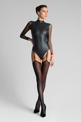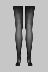 Signature Maison Close rolled-edge stockings. The black color elegantly accentuates the legs for a unique style. Silky 40-denier sheer stockings to pair with a garter belt for a perfect fit.
