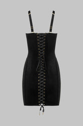 At the back, an adjustable lace-up detail — adorned with gold eyelets and jewelry-like tips — ties at the waist and hem. A floating velvet lining sits beneath the lacing, allowing the dress to be worn fully opaque or left open to reveal the skin beneath.