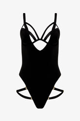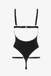 The One-Piece Swimsuit Fatale blends structured design with a form-fitting silhouette. Crafted from soft, opaque microfiber, it offers a second-skin feel. The molded cups are cloaked in microfiber and outlined by a bold, uncovered elastic along the neckline. A subtle "mono" underwire provides discreet support, enhanced by bust darts. The wide straps are adjustable with gold-toned metal accents, while the back fastens with a clasp for a perfect fit. Around the thighs, fully removable and adjustable elastics create a customizable, refined bondage effect. Lined only at the crotch, this swimsuit remains lightweight and effortlessly sensual.