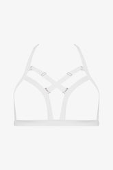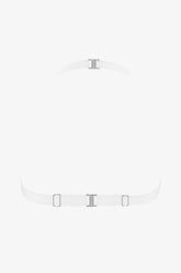 The Open Triangle Bikini Top Fatale redefines swimwear codes with an ultra-graphic design. Made of microfiber-covered elastics, it frames an open triangle for a sensual look, perfect worn alone or layered over another piece. The straps are adjustable at the neck and back, adorned with delicate gold-toned metal accents. The top fastens with two gold clasps. The neckline is framed by uncovered elastics, fully adjustable and removable, to be styled straight, crossed, or not at all – offering a masterfully controlled bondage effect. Free from underwires, this bikini top remains comfortable with covered elastics under the bust and around the back.