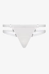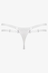 The Fatale String Bikini Bottom is crafted from soft, opaque microfiber for a smooth touch and comfortable fit. The sculpting fabric, lined only at the crotch, delicately hugs the silhouette. Its barrette-style back features graphic lines, while the side elastics, covered in microfiber and joined by golden rings at the front and back, allow for customizable coverage. The thigh elastics are fully adjustable and completely removable thanks to gold metal hooks, offering a refined bondage effect that remains entirely versatile.