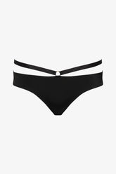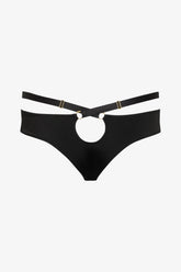 The Tanga bikini bottom Fatale is crafted from soft, opaque, and sculpting microfiber, offering a second-skin effect with ultimate comfort. Its high-cut, slightly high-waisted silhouette elongates the legs while enhancing the waistline. A refined play of bondage-inspired elastics is accentuated by a gold ring at the front and two at the back, revealing an adjustable keyhole detail. The waistband elastic is adjustable via small, non-removable gold-toned metal accents, for a look that is both graphic and minimalist. Lined only at the crotch.