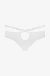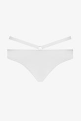 The Tanga bikini bottom Fatale is crafted from soft, opaque, and sculpting microfiber, offering a second-skin effect with ultimate comfort. Its high-cut, slightly high-waisted silhouette elongates the legs while enhancing the waistline. A refined play of bondage-inspired elastics is accentuated by a gold ring at the front and two at the back, revealing an adjustable keyhole detail. The waistband elastic is adjustable via small, non-removable gold-toned metal accents, for a look that is both graphic and minimalist. Lined only at the crotch.