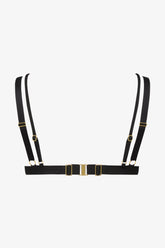 The Triangle bikini top Fatale is crafted from soft, opaque microfiber for a second-skin feel. Its triangle cut, enhanced with bust darts, offers a naturally elegant fit, with no padding or underwire. The standout feature of this piece: a microfiber triangle framed by a subtle play of elastic straps, creating a refined bondage effect. The delicate straps are adjustable with gold-toned metal accents. The back is adjustable and fastens with a gold-colored clasp. A covered elastic under the bust ensures both comfort and support.