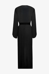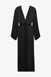 The Fever Kimono is crafted from fluid, semi-sheer black viscose crepe perfect for adding a touch of lightness to any swimsuit. Its long, straight, and flowing cut is structured by a removable black belt with beveled edges, threaded through two side loops. The wide, long sleeves enhance the airy, billowing silhouette of this piece, ideal for wearing over swimwear or as elegant resort wear.