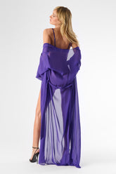 The Fever Kimono is crafted from fluid, semi-sheer viscose crepe in an electrifying shade of violet—perfect for bringing a sense of lightness to any swimwear look. Its long, straight, and flowing cut is structured by a removable black belt with beveled edges, threaded through two side loops. The wide, long sleeves enhance the piece’s airy, voluminous silhouette, ideal for wearing over a swimsuit or as elegant resortwear.