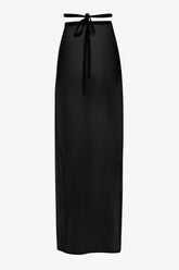 The Fever wrap skirt is crafted from semi-sheer black viscose crepe, fluid and lightweight perfect for sun-drenched days or refined layering. Its straight cut and generous length elongate the silhouette, while the gently curved slit on the left front subtly reveals the leg with every movement. It ties at the waist with two slender straps for a simple, natural fit.