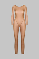 Long sleeve catsuit with round neckline crafted from a fine jersey with shiny, subtly sheer reflections. The front reveals a minimalist and refined silhouette, while the back is fully exposed down to the small of the back with delicately ruched lacing at the neck. The lacing is adjustable thanks to unique sliders and gold lipstick accessories signed by Maison Close.
