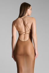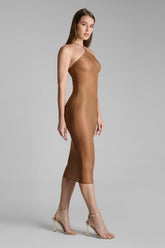 Midi-length dress with semi-halter neckline crafted from a fine jersey with shiny, subtly sheer reflections. The open back is enhanced by a lacing detail, and the halter neck is adjustable thanks to unique sliders and gold lipstick accessories signed by Maison Close.