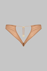 Open panty crafted from a fine jersey with shiny, subtly sheer reflections. Designed to elegantly reveal heart-shaped curves. The opening is adorned with ruched lacing that shapes the buttocks beautifully and allows for a personalized fit thanks to a unique slider and gold lipstick accessories signed by Maison Close.