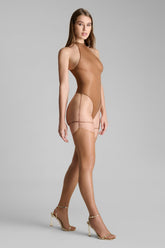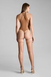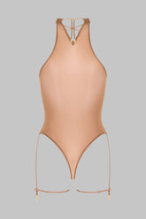 American halter neck thong bodysuit crafted from a fine jersey with shiny, subtly sheer reflections. A side-cut halter neckline enhances the silhouette. The high neck opens with delicately ruched lacing, adjustable thanks to a unique slider and gold lipstick accessories signed by Maison Close. Two removable garters with gold accessories call for stockings to elevate the look. Adjustable fastening with hook-and-eye closure at the crotch.