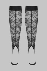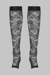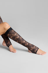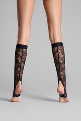 These leg warmers are made from mostly recycled openwork lace. Fitted style with flat elasticated trim. Scalloped opening at the back of the leg. Open toes.