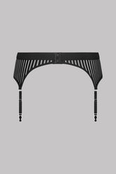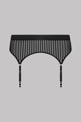 Microfibre garter belt with openwork, transparency and graphic stripes. Detachable and adjustable suspenders with silver trims. Plain black microfibre-covered elasticated waistband for extra comfort. Rounded lines to sculpt curves. Adjustable hook-and-eye fastening on the back.