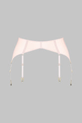 Garter belt in 100% sheer mesh. Arched front with lined mesh for a contrast of transparency and opacity. Six adjustable, non-removable garters outline the thighs. Sleek and subtle hook and loop back closure.