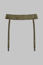 Suspender belt in natural silk. An elastic waistband covered in gathered silk and accessorised with a golden clasp. Golden decorative attachment to place on the front or the back according to your desires. Four detachable, adjustable suspender straps with gold accents. The two short suspenders are placed at the front, the two longer suspenders at the back.