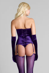 ROCOCO garter corset in velvet, inspired by traditional corsetry, designed to sculpt the waist and define the silhouette. Flexible steel boning and a firm inner lining shape a structured fit that creates a controlled push-up effect while ensuring comfortable wear.