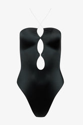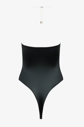 One-piece string swimsuit blending satin softness with elegant style. Featuring a bustier cut inspired by the 1980s, enhanced by a delicately pleated lace-up detail at the front. This swimsuit offers refined cutout adjustments with a unique slider and Maison Close’s signature gold lipstick accessories—customizable to suit your every desire.