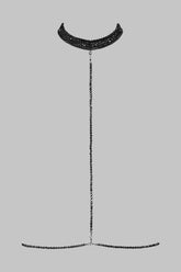 A jewellery harness made from jet black faceted glass beads, the "À ton cou" harness reflects the light as you move. Adjustable thanks to chains that can be altered to fit you. Separable collar and waist.