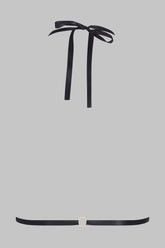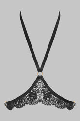 Harness made of fine guipure that wraps around the neck and under the bust. It's like jewellery against the skin, adorning and accentuating the cleavage. Wear on its own or with something from your wardrobe. Delicate satin ribbons that can be adjusted at the back with fine gold accessories and tied at the neck or left untied, to suit you.