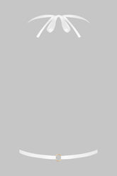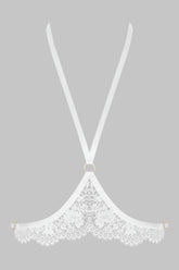 Harness made of fine guipure that wraps around the neck and under the bust. It's like jewellery against the skin, adorning and accentuating the cleavage. Wear on its own or with something from your wardrobe. Delicate satin ribbons that can be adjusted at the back with fine gold accessories and tied at the neck or left untied, to suit you.