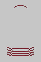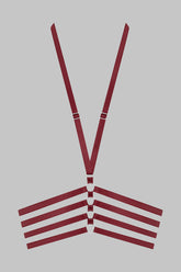 Harness by Maison Close. Clusters of fine silver rings and elasticated burgundy ribbons create a jewellery-accented accessory to subtly accentuate your nudity. Adjustable to suit all body shapes. Matches our lingerie and prêt-à-porter collections for a top-to-toe fetish chic look.